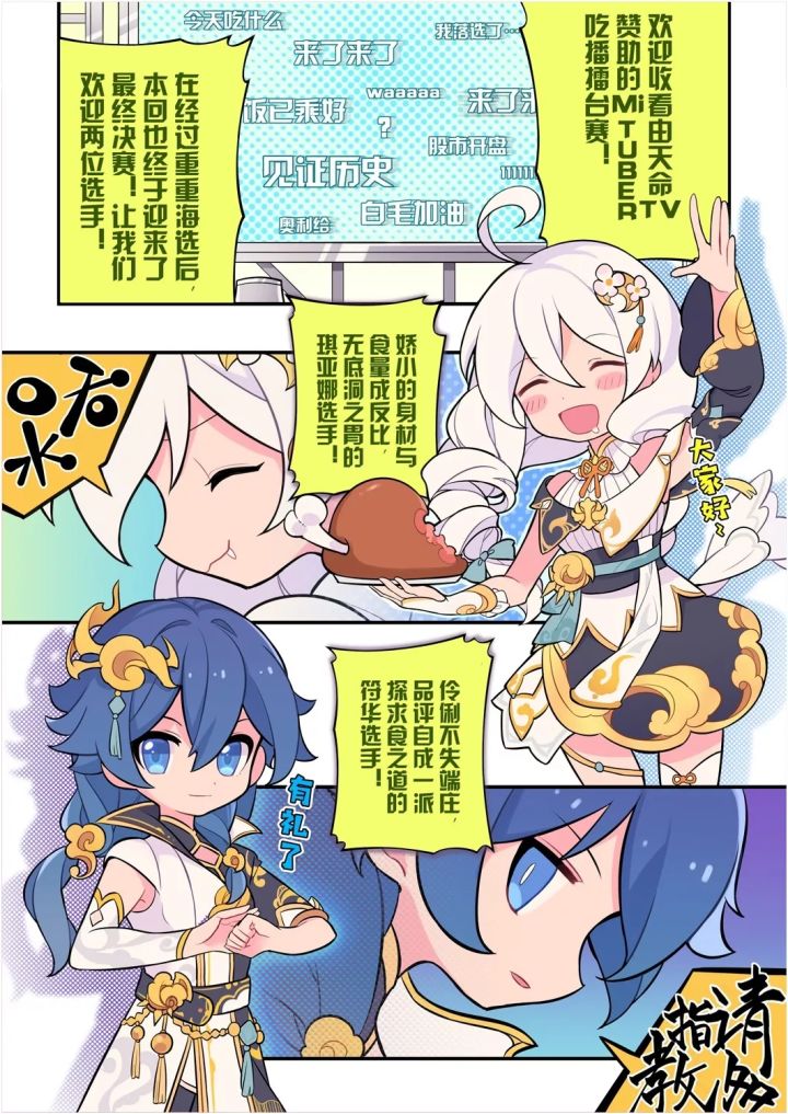欢迎收看天命TV赞助的MiTuber吃播台赛,本期将由两位一路吞食天地,历经重重海选脱颖而出的选手为大家带来终极对决——究竟是伶牙俐齿黑洞胃的琪亚娜选手,还是端庄品“平”自成一派的符华选手可以斩获人气吃播的冠军呢?请各位dalao在弹幕应援的同时,顺便不要忘记素质三连哦。ヾ(◍°∇°◍)ノ゙嗨嗨~各位小伙伴们新年快乐呀!这里是千里迢迢为大家送上新年祝福的崩坏娘!当然啦,新年祝福可不是简单