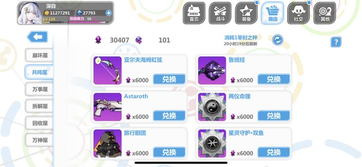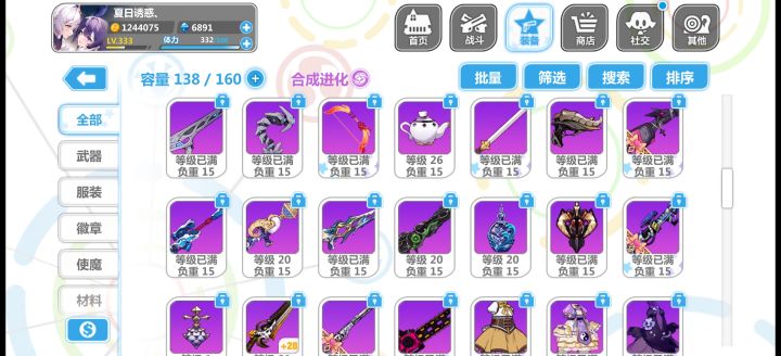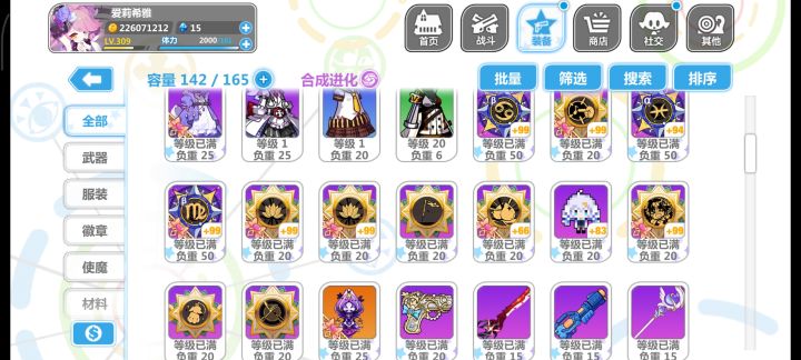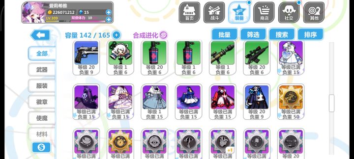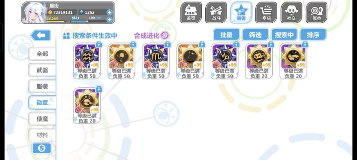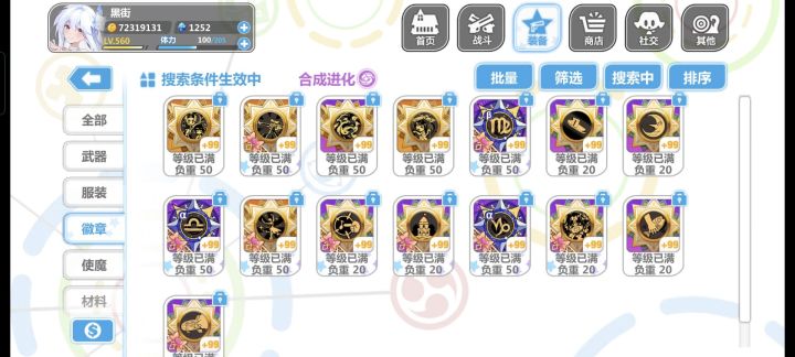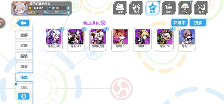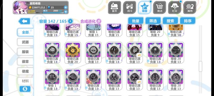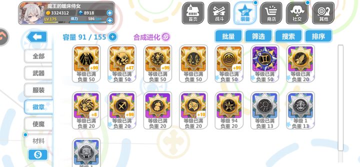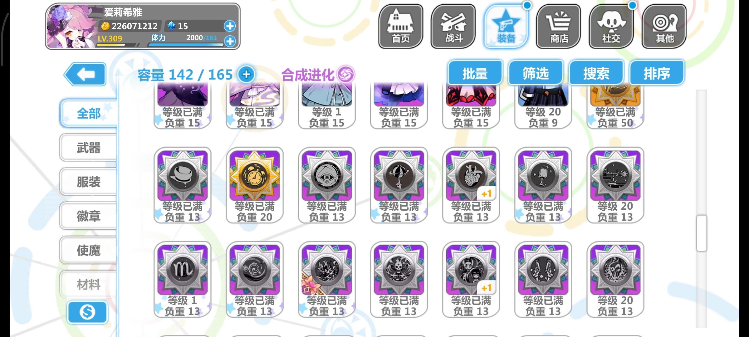 回归玩了个初始,大概玩了三个小时,把永生花那个池子都快抽干了,最后抽满100换了个夜光杯,处女座那个徽章不进化简直是一点用没有,自己把自己打死了,现在大概就这么带的装备,实在不知道怎么带,看攻略说做娃娃套,结果好多东西包括使魔根本没找到换的地方,什么雪人徽章和Rh这些压根没看见哪里有,垃圾屋里面买的衣服和处女座徽章处女座进化要30个碎片,肝不动了实在,一直在刷轮转试炼最后那张图刷碎片,空想娃娃也