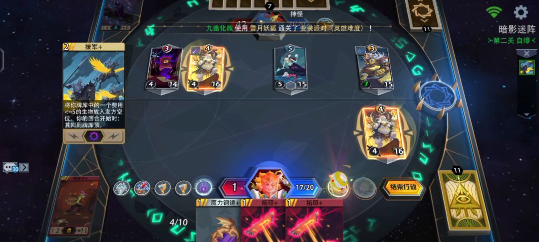 通关思路是不断的回手海洋孢子塞进对面手牌,控制龙神血量让对面抽牌抽死自己,一阶段的控制好节奏。血量差不多可以斩杀或者让对面抽死自己也行。起手刷风神和海洋孢子。把海怪回手留在手里,不然龙神死太快直接进二阶段就没得玩了。俩张强夺最好在6费前打出把对面的直伤牌拿过来。红龙>流星火雨>绿龙>连锁火球>仙女龙其他不建议。船长或者元素当一次刀或者血量不满收回来,元素可以放在对面龙神面前。海洋孢子最好是回手完