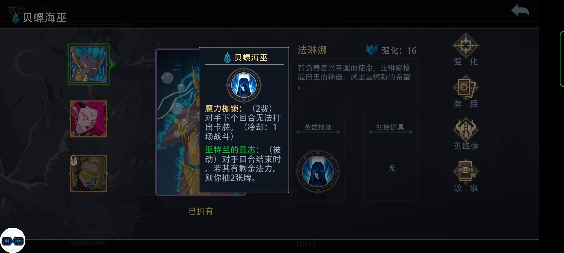 水系:贝螺海巫主动禁用手牌一回合,稳定触发被动抽牌,如果打到后期费用移除,被动还能源源不断地过牌。说实话竞技场出来第一天我就觉得贝螺的强度要逆天了,铺场主动锁你一回合,被动还提供了大量的过牌。但是从现在来看,只能说很可惜她是个水系,不然还能更逆天。使用指南:① 贝螺算是一个打中后期的英雄(水系大多节奏慢),所以大局观和细节比较重要。开局就要看手牌规划接下来几个回合的费用,因为场面劣势开技能也