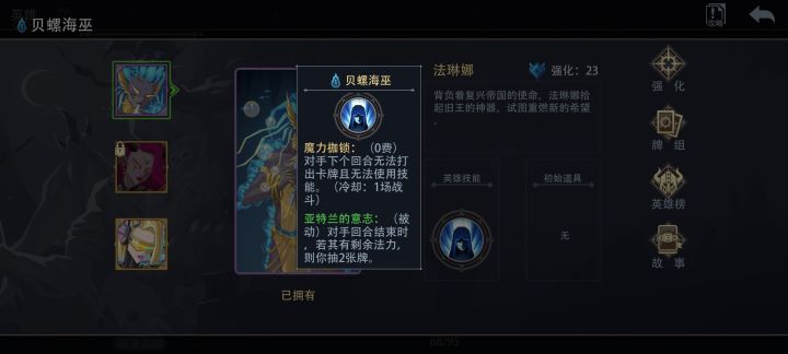 本系列旨在利用英雄技能特性通关地狱三,因为是新手向所以加上了不使用初始卡池的前提以及我自身强迫症不使用卷轴符石(复活待定)。 湖水之灵,紫卡,主动技能一费冷却一场战斗效果为本回合内友方生物进场触发时触发两次,被动技能效果为友方生物触发进场效果时法力加一(一回合该被动最多触发12次),升级后法力加一的同时触发进场效果的友方生物攻击加一。 思路:利用心灵回响在一回合内多次触发进场效果增加法力,利用魔力浮龙增加攻击。 封印:非初始封印除大小蓝龙全部,初始可封印法术加大拿心灵回响概率,也可封印无进场效果生物卡加大拿魔力浮龙或有进场效果生物。(我因为个人习惯选择前者,但建议选后者或者雨露均沾,因为心灵回响是蓝卡魔力浮龙紫卡,相对而言心灵回响不难拿) 拿牌推荐: 生物卡:魔力浮龙(初始),大小蓝龙(非初始),珍珠贝少女(初始,可用3费初始卡月夜歌者替代),飓风魔偶(初始),其它进场生物 魔法卡:心灵回响(初始,最优先),飓风(初始,需升级可替代飓风魔偶也可不拿),灵贝之光(初始,过牌手段匮乏的前期要拿),法力潮汐可拿可不拿,静默之咒(初始,建议拿一张防止部分怪技能打脸),其它不建议拿 道具:龙蛋(开局衍生小蓝龙,没有解锁大小蓝龙优先级最高),治疗药剂、香草药包等回血道具,各类衍生卡的道具,其它看情况,不知道拿了好不好就不拿。 Ps:如果拿牌不顺利可以重来,不是每次都可以那么顺利,要习惯失败,单局如果失利或者扣血太多右上角重新战斗,怪的出牌顺序基本不变。非刷分向后面尽量少走?格,避免卡组被打乱或者丟掉key牌,卡组成型可以直接空格横跳过时间,速刷同理 最近比较闲,那就一天一到两个,出完了我弄合集,明天哪个好?