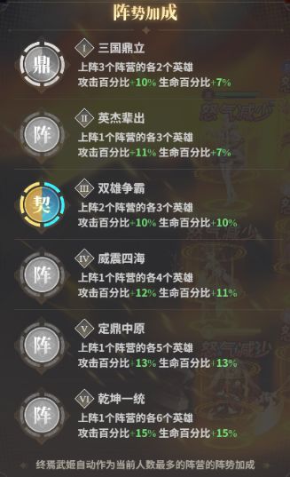 目前游戏内武姬阵容分为:魏,蜀,吴,群四个国家终焉是比较特殊强力的存在。游戏中上阵不同阵营的武姬会有不同的加成以下是我个人推荐的新手阵容,目前推图能力比较强的还是推荐吕布为主C关羽为副C的阵容。3群+3蜀 吕布(主C单体爆发)+貂蝉(控制)+诸葛亮(回血,回怒)+贾诩(控制,增益)+关羽(副C)+张飞(肉盾,无敌盾) 吕布(单体爆发) 吕布的9星,11星,14星,16星的天赋都是质的