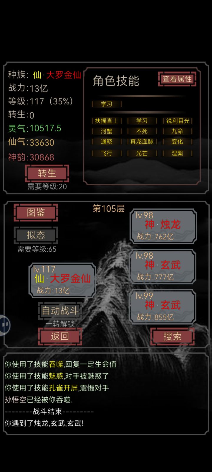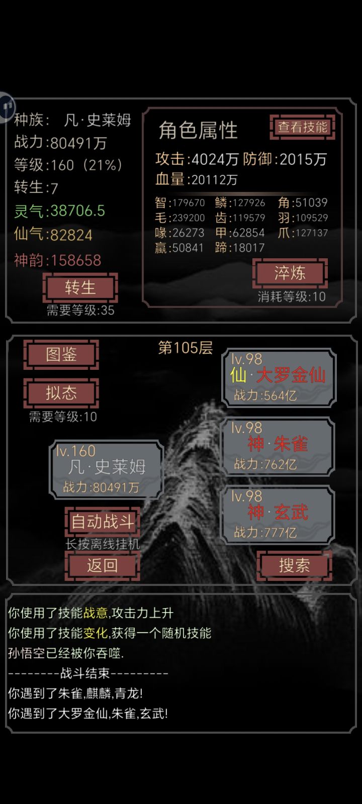 【极简攻略】零转生过孙悟空(117级)#开局一只史莱姆 【拟态升级】拟态人仙系自带学习(5技能格),可再吞噬一次人仙系的学习技能,怪物主刷人系凡仙,可少刷灵气方便仙气第一拟态大罗金仙,最终拟态大罗金仙之前,至少要过第30层(出灵明石猴)方便吞噬技能,也可用淬炼消耗10等级来提高拟态成功率。拟态流程:10级凡人→30真人→50真仙→65大罗金仙【技能吞噬】65最终拟态成大罗金仙后再消耗等级