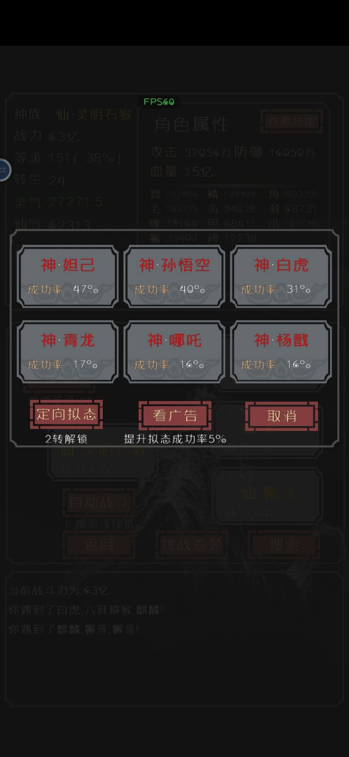 如果你已经打通关了,那么你解锁了拟态boss这一项 如何变化孙悟空呢首先,我们10级拟态就选灵明石猴,怎么选呢,看广告加状态成功率,打开定向拟态把下面一堆亮出来然后点那个广告,快速点击5次,可以加25%,多试几次就可以10级变灵明石猴了,然后拟态就直接跳65级了 挂机升级一下就可以选孙悟空了。