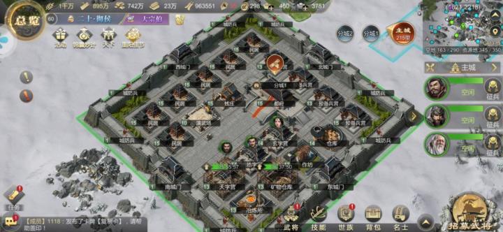 一、分城是什么游戏内玩家初始主城是由系统随机产生的,但是分城是由玩家进行选择的,分城可以说是另一个主城,依然可以建造建筑,派遣部队等等。 二、分城如何建造在游戏中,玩家等级达到25级、50级的时候可以分别建造一座分城,分城只能建造在7级、8级、9级、10级土地上,并且占领周围7x7的土地,建造时需要分城建造令。由于分城建造令需要世族达到一定等级后才可以购买,前期可以通过攻打县城获取虎符,清缴