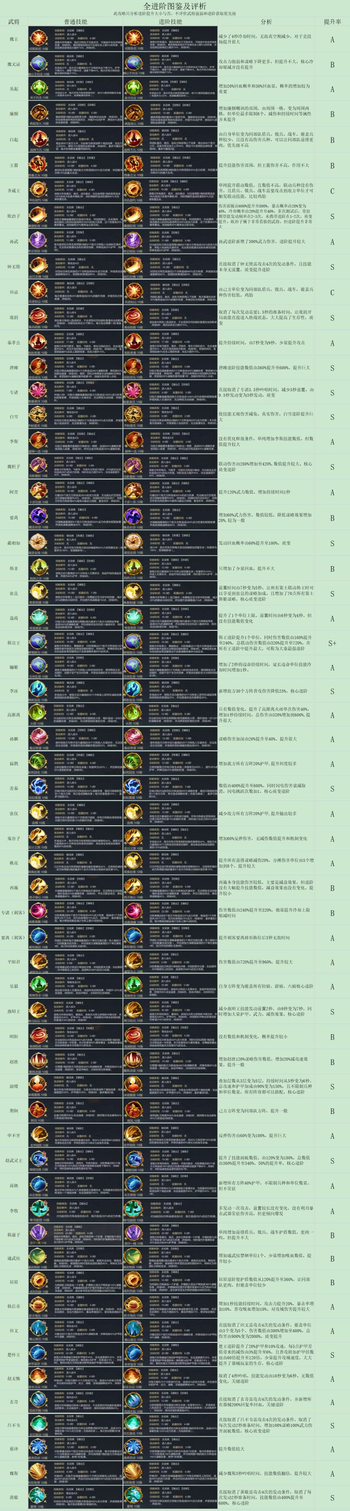 仅供参考由于武器进阶获取难度较高,加之目前没有明确的已携带进阶技能图鉴说明。导致大家无法判断自己是否该购买某一个进阶武器,在此,统计出游戏内所有的武器进阶,并带有解析评价,解析仅是个人理解,仅供参考。图片有点长,辛苦君上的小手指滑动这么久啦~~可以把图片保存到相册里哦,以备不时之需~~#大秦帝国之帝国烽烟 #游戏日常 #攻略