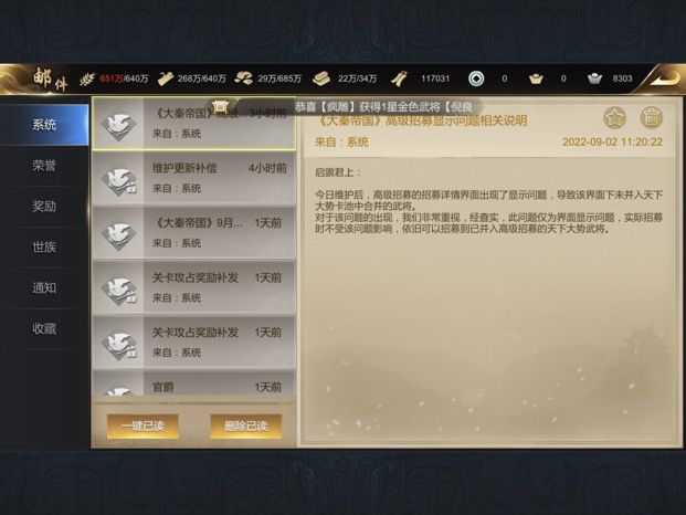 自从前几天改版了,抽武将都变成什么鬼样子了,高级招募抽3.0加3.5和起来是55个。一个核心的3.5武将都没有,之前还能白嫖魏无忌,张仪,扁鹊,商鞅,昭阳这些。现在都没有了,只能在心愿和举将里面弄了。这改变的我有点接受不了.那些新区上来的没核心武将怎么玩。。。。还有就是武器图纸的问题,出图纸的几率是多少,我这个赛季最少弄了200个增产礼包,一张武器图纸都没出,你们是不是又改几率了,