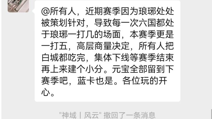 近期赛季因为琅琊处处被策划针对,导致每一次六国都处于琅琊一打几的场面,本赛季更是一打五,高层商量决定,所有人把白城都吃完,集体下线等赛季结束再上来建个小分。元宝全部留到下赛季吧,蓝卡也是。各位玩的开心。