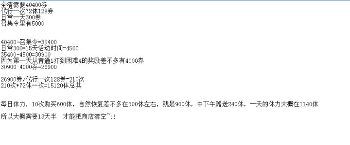 具体看内容,,不懂的下面问,不过大概说一下,如果想全清,至少活动期间内,不能刷别的图和四象。。除非有选择性的购买。。召集令不用买,普通的就可以,平民玩家不需要买这个,性价比不是很高,氪佬无视这句话。综合这次活动,其实问题还是暴露出来了。。体力!!!体力!!!体力!!!以上我算的体力都是没有体力石的情况,因为并不是每个人都会有这个。。有些人攒了可以用,但是这个不是所有人都有。。也希望官方看一