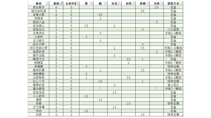 在日刊里长摁衣服就可以看到得分系数了,具体怎么计算的不太清楚。衣服左边有标签的就是能算分的部件。所以即使没有集齐套装,只要得分部分齐了也可以放心升级。其中推荐练的套装是小王子和知更鸟,容易获取分数倍数高生效部位多还是四星套装不愁缺球。其他的风格找系数2.5~3左右的就行。推荐魔力灌注优先级:1.4星>5星,6星可以等灵感够用了练,5星最好同一时间只养一套2.手帐解锁>花盒>惊奇宝箱 因为钥