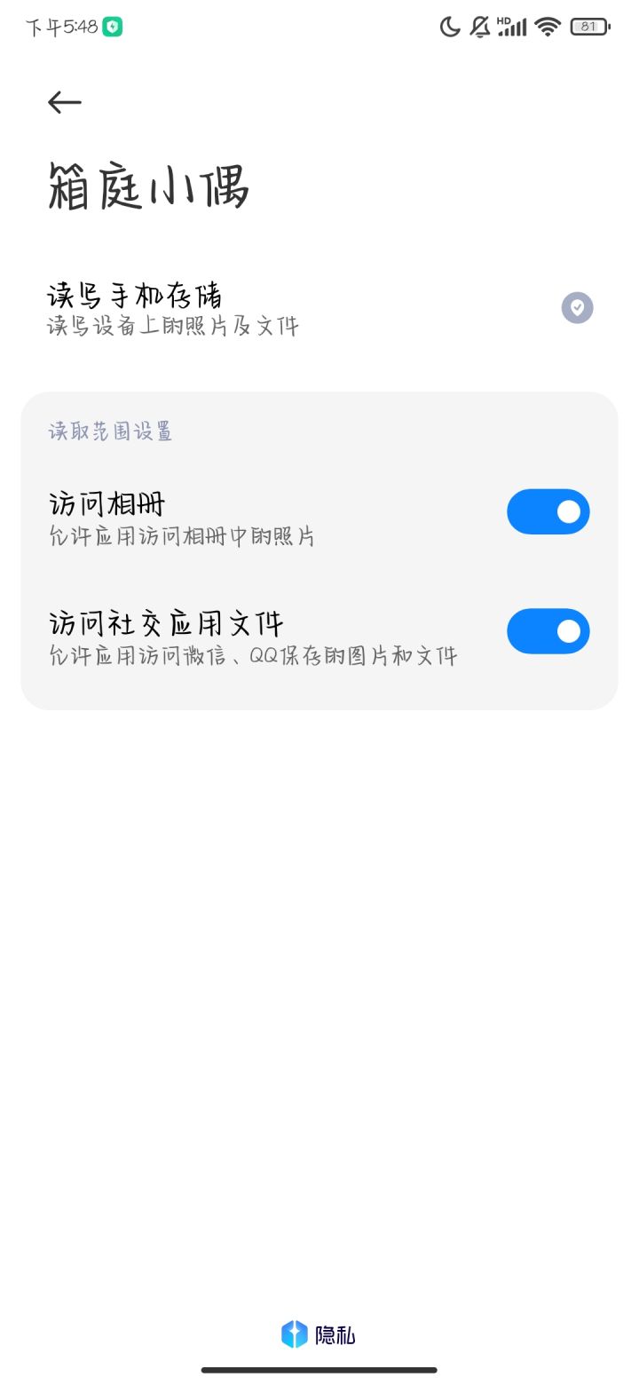 看到有人说,看广告,一不小心就自动下载很烦,想关闭小偶的一些权限,我就也去看了一眼。你要我相册,QQ,微信里的图片干嘛?默认是打开的然后我去看了眼闪暖的,人家默认是关的我也不想拉一踩一,但你要这个权限干嘛?支付宝要这个还算有原因,需要扫描相册里图片的二维码,你要这个不是侵犯隐私吗?