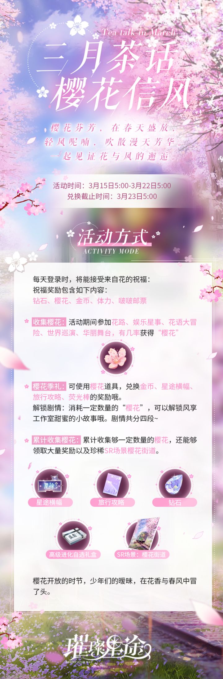 樱花开放的时节,少年们的暧昧,在花香与春风中冒了头。活动时间3月15日 05:00 - 3月22日 05:00(奖励兑换截至时间3月22日 05:00 )活动说明活动期间,每日登录游戏,接受来自花的祝福吧。参与花路、娱乐星事、花语大冒险、世界巡演、华丽舞台,均有几率获得道具【樱花】!集齐一定【樱花】,可解锁风享工作室甜蜜小故事,累计收集还可换全新限定SR场景【樱花街道】及大量培养材料。✦✦