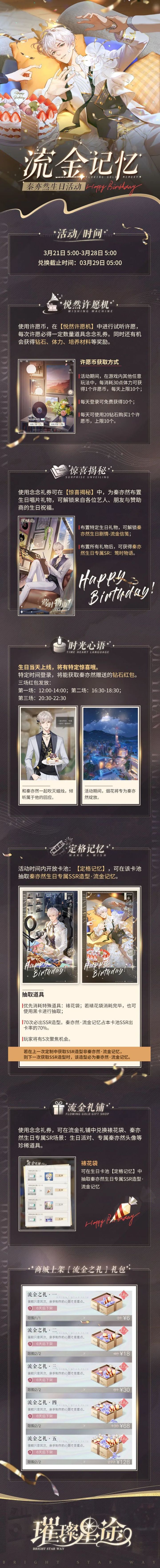 「我很乐意自己在你心中更无所不能一点。」✦✦✦活动时间3月21日5:00-3月28日5:00 (兑换截止时间:3月29日5:00)活动内容为他布置生日礼物,解锁生日剧情,还可获得生日专属SR[秦亦然·莺时物语]。同时限定卡池【定格记忆】开启,生日限定SSR[秦亦然·流金记忆]享受概率UP。生日当天上线,还将有特别惊喜哦,和秦亦然一起吹灭蜡烛,倾听属于他的回应吧!※更多玩法详情点击下方图