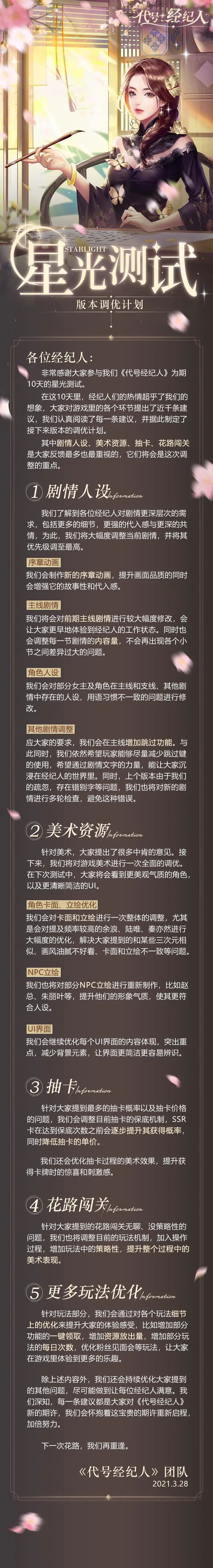 “星光”测试期间各位经纪人反馈了许多的建议及意见在认真阅读这些反馈内容后决定对游戏进行优化具体内容如下✦✦✦经纪人们对本次调优计划都有哪些看法,或者还有哪些意见和建议,都欢迎在评论区留言,和小狮子说说哦~