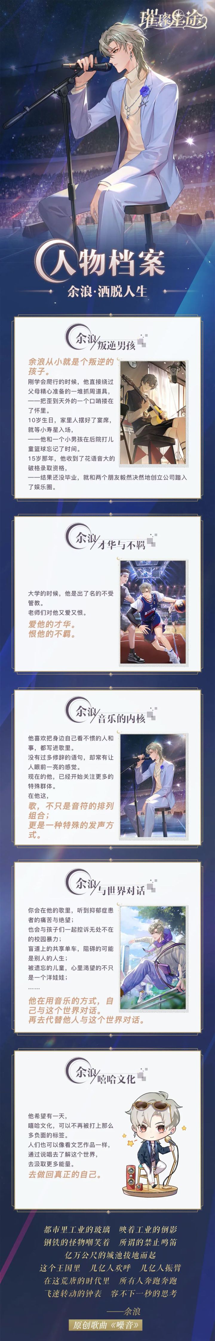 本期是最后一期人物档案rapper——余浪来啦!各位对他的印象应该是“游戏黑洞”吧作为一个想引领潮流的rapper他的人生关键词又会是哪些呢?快随小狮子一起来看看吧~✦✦✦✦✦✦最后一期人物档案已经落下帷幕大家对各位艺人是否已经熟悉了呢?还有什么想知道的可以评论区留言告诉小狮子!