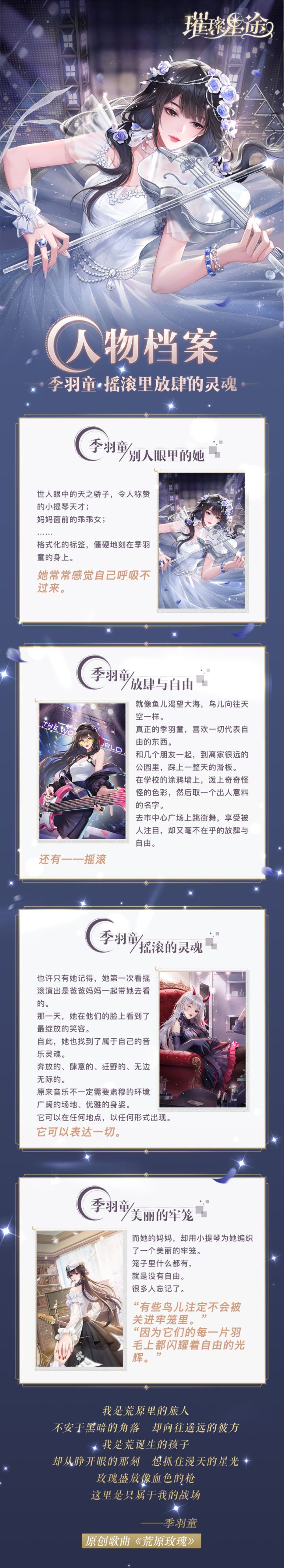 我想看到你开心 想看到你经常那样笑——季羽童经纪人们想必对季羽童印象深刻吧~一个天才小提琴少女,却选择追逐摇滚梦在她眼里,小提琴就是母亲为她编制的美丽的牢笼而摇滚,则是她追求的自由同时,她想用摇滚让绽放的笑容出现在父母脸上正如她说的“我想看到你开心,想看到你经常那样笑”✦✦✦精灵古怪的她想必会成为各位经纪人最好的姐妹还记得季羽童时而深沉,时而活泼的声音吗?小狮子今天特意