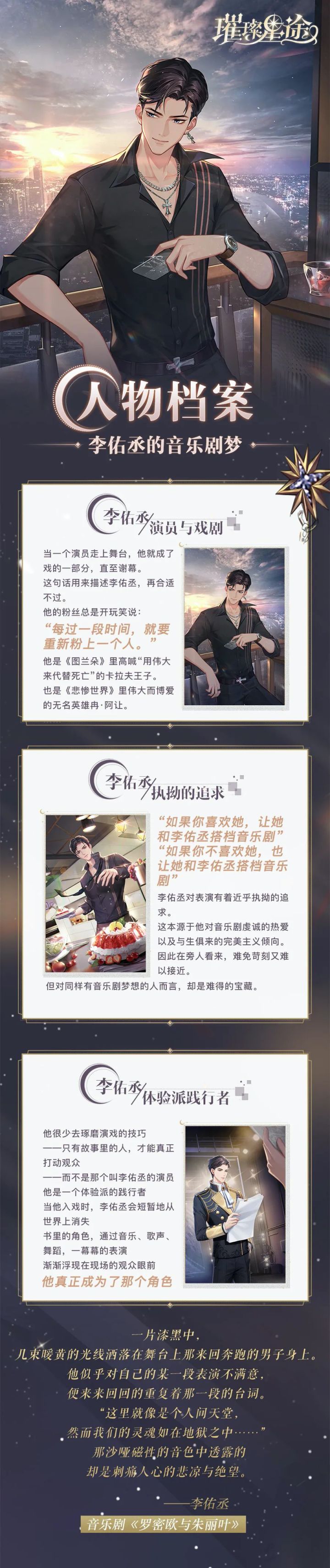 人物档案已经渐渐接近尾声本期介绍音乐剧演员——李佑丞追求完美主义的他每次都完美入戏让人每隔一段时间总要重新认识不一样的他那么,在他的人生中又会出现什么关键词呢?快随小狮子一起来看看吧~✦✦✦✦✦✦接下来还剩下两位艺人没有介绍了哦~余浪or陆唯,究竟下一期会介绍谁呢?在评论区留言猜一猜吧!
