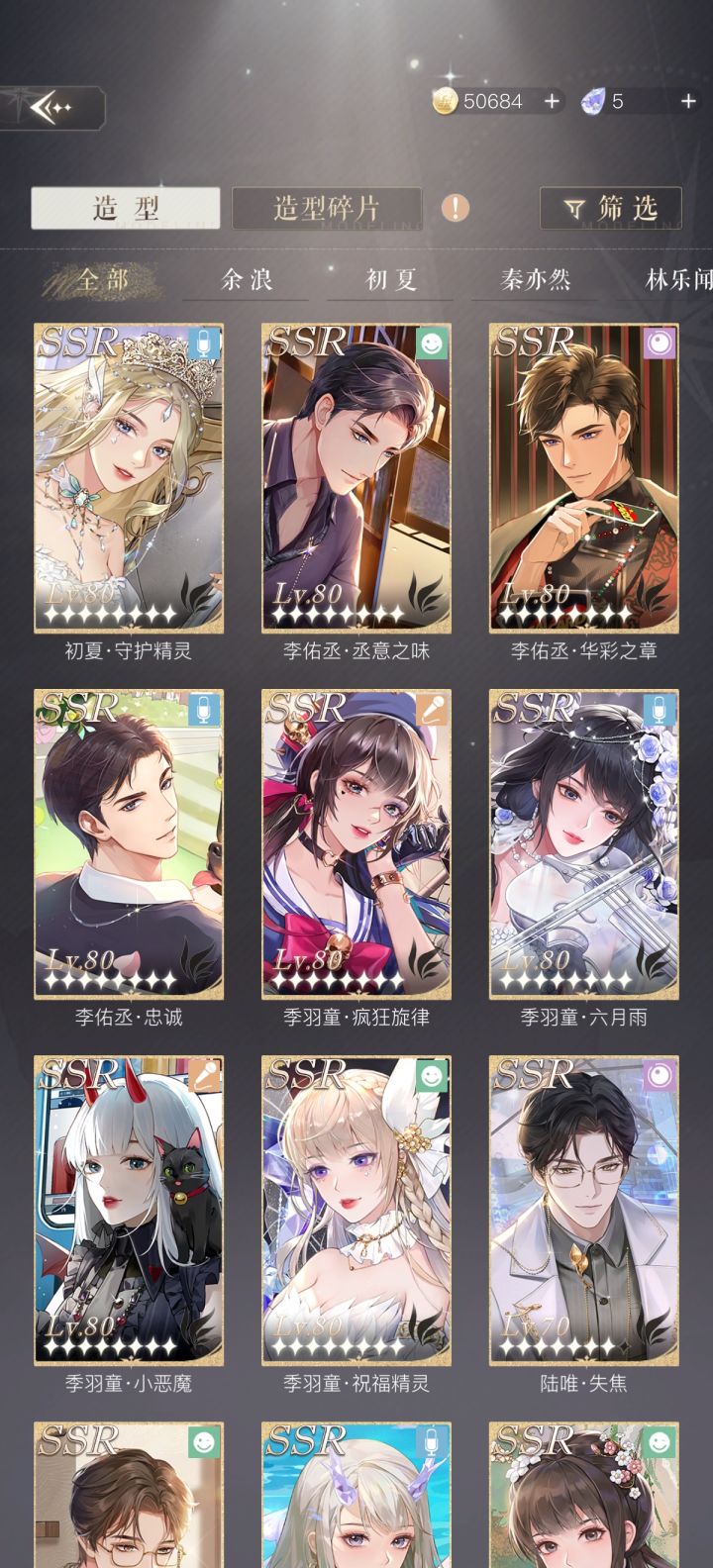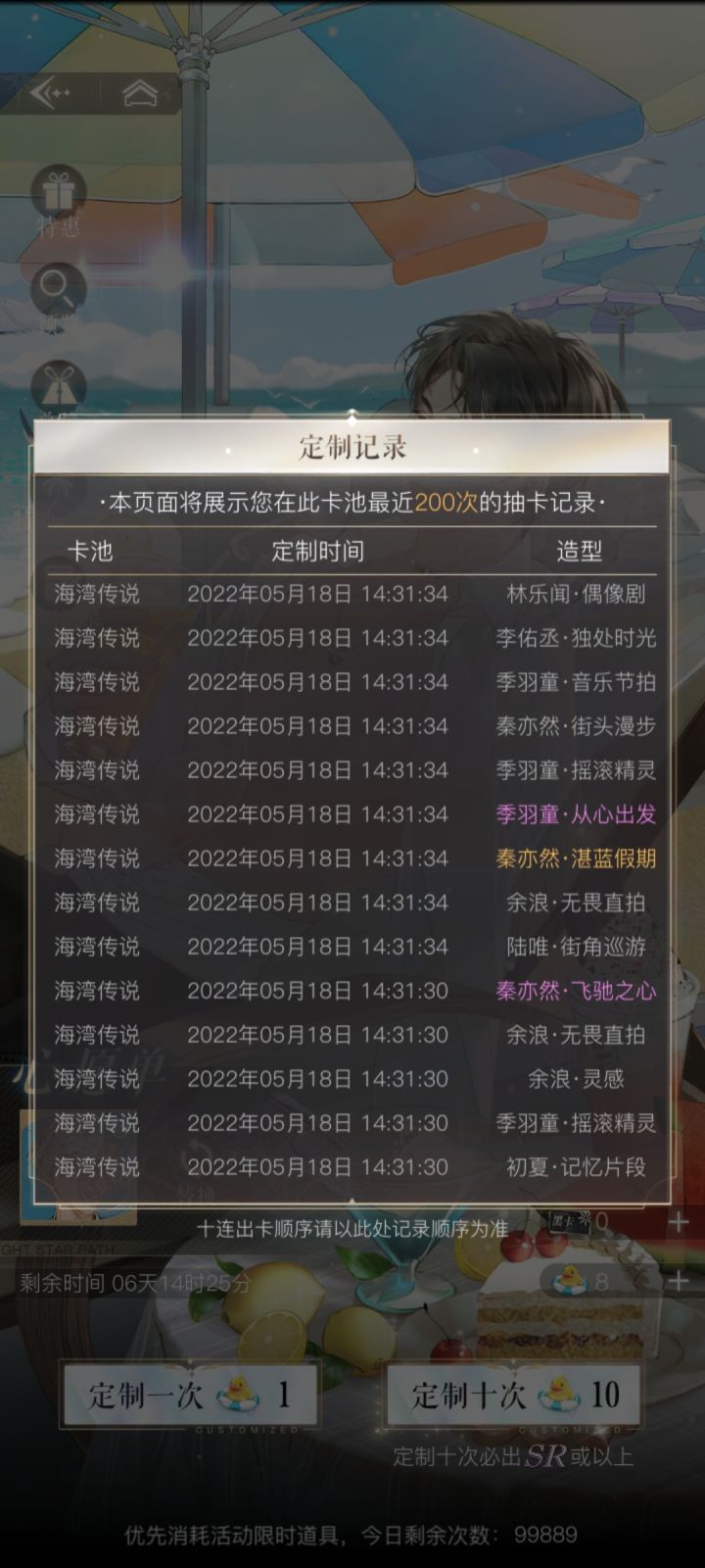 不知道为什么小号总是比较欧零氪这次湛蓝假期的卡除了余浪其他都抽到了除了第一次活动只拿到了初夏第二次活动8抽拿到童童,25抽拿到李佑丞第三次19抽拿到2张林乐闻,91抽拿了5张ssr,4张活动限定1张普池卡
