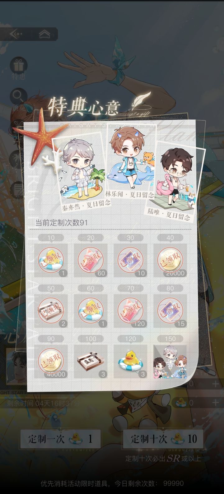 90抽四金,爽到!秦亦然的卡是拿羽毛换的,90+30+60抽,夏活的夏姐童童乐闻亦然4张想要的卡都拿到了!心满意足,等童宝的生日卡了!