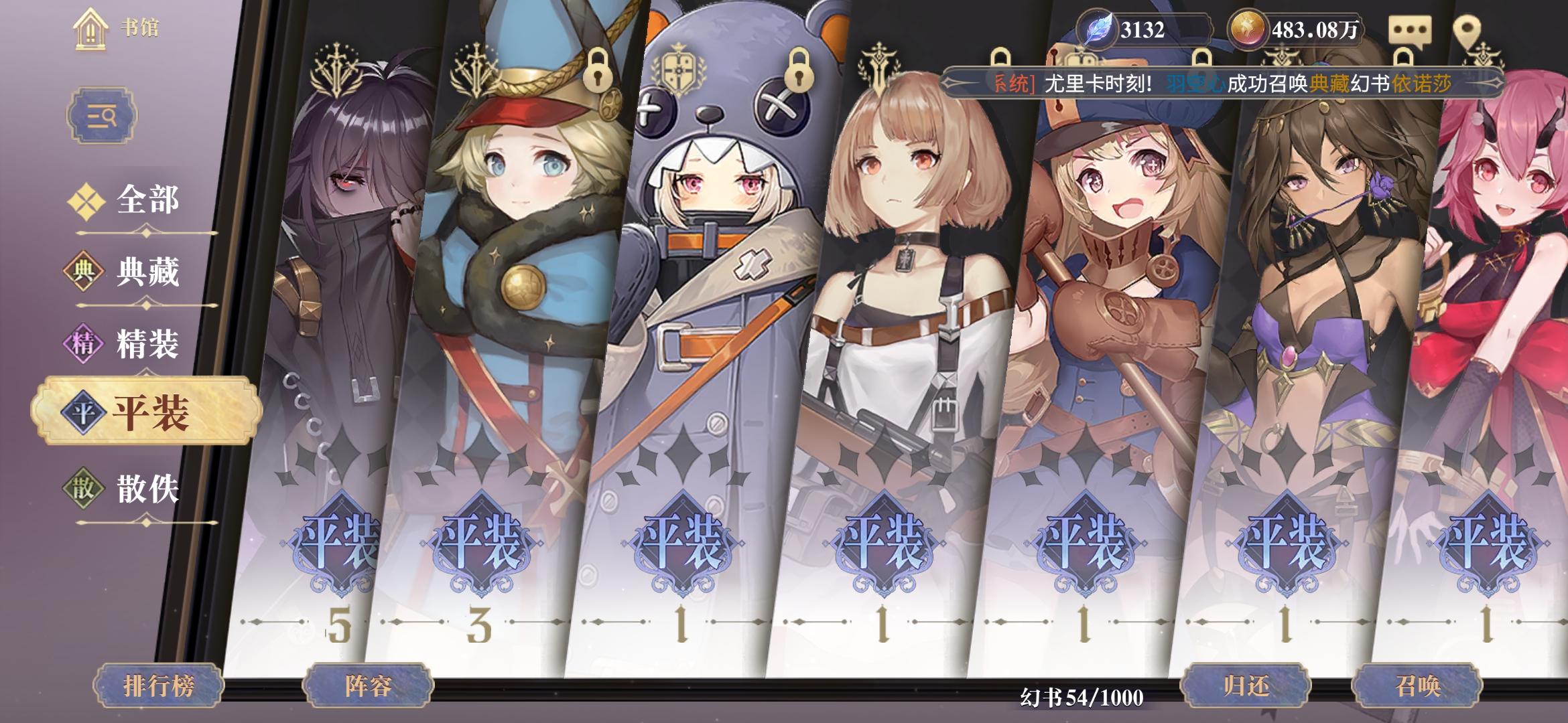 如图,距离典藏还有13次,黑号不解析如图,没有充值一块钱,游戏很良心。第四章随便打,主要没有体力,宝石都用了抽卡了。这个是平民的阵容,推图很变态,运用狐狸的吸精技能一波流。