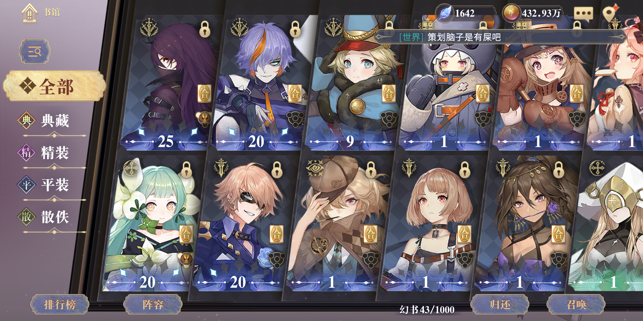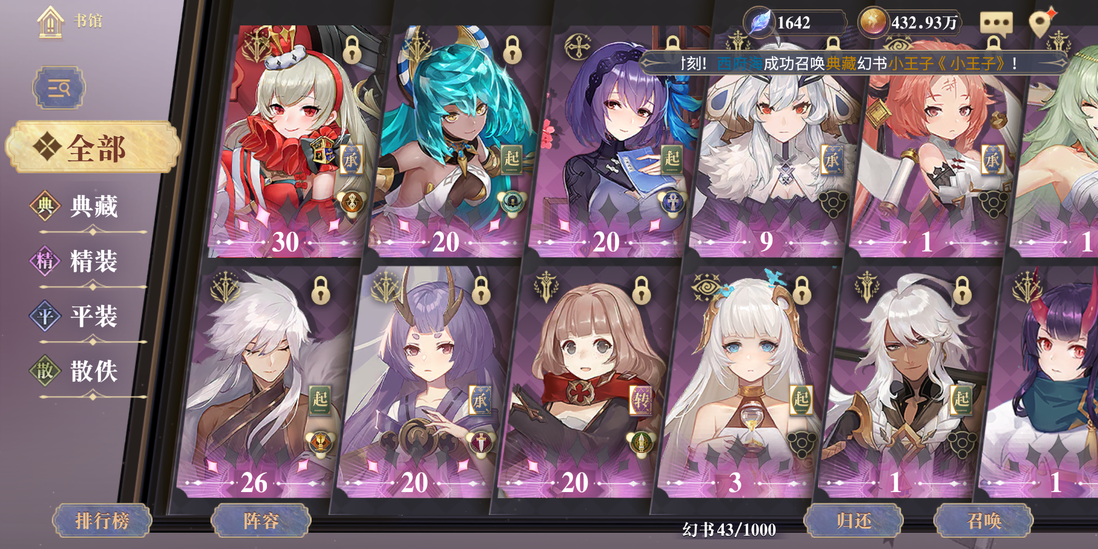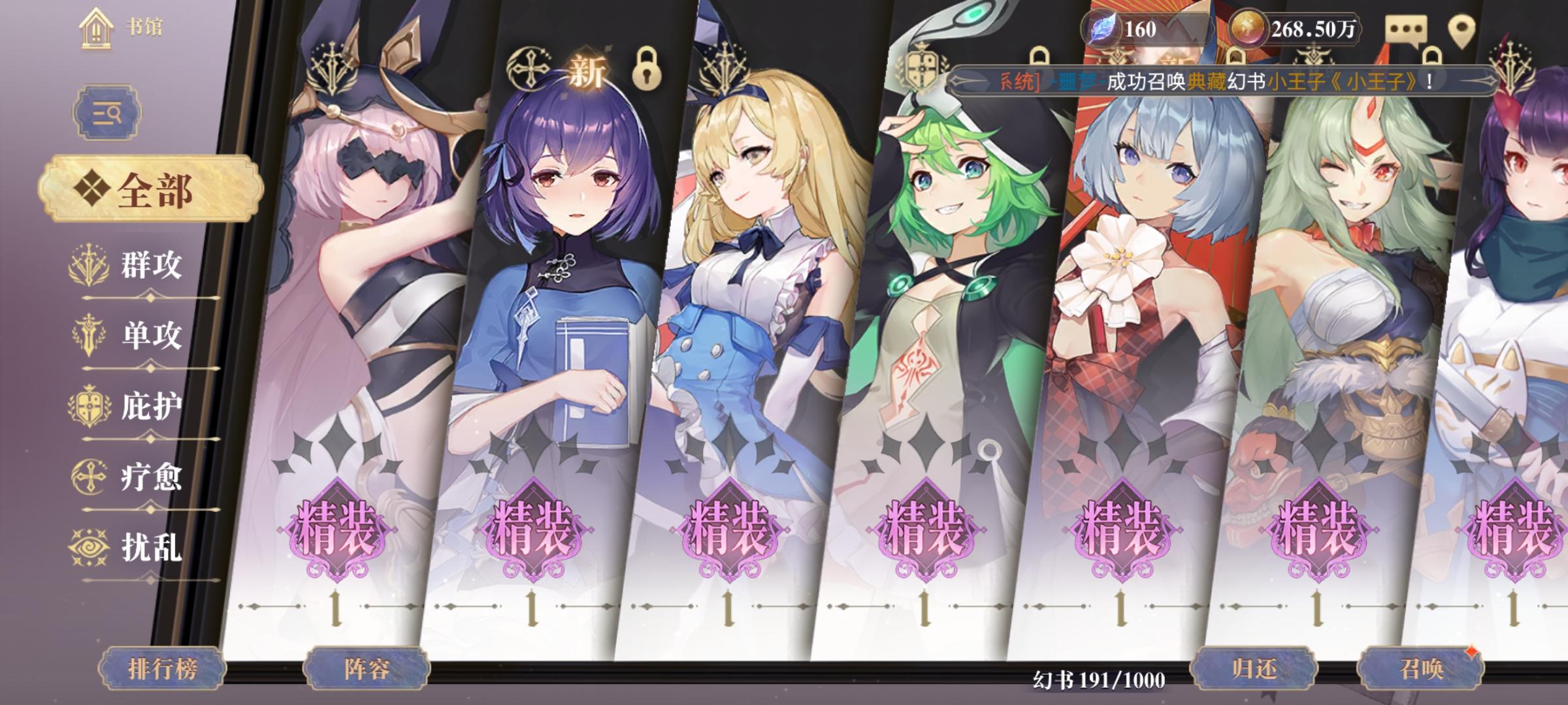 主要通关是小王子阵容,新手池小王子保底,太帅气了,直接爱上了他,虽然前期确实很刮,但是看到这么高贵的气质,还是原谅了他,努力为他升级。一开始阵容章鱼怪,小王子,人间词话,曲流殇小王子站前排,人间的阵开到小王子同时卡怪边缘,平a会触发结界被动,加25%攻击,小王子叠满后攻击还不错,纯真别断,不要自动,自动会有能量就开。援助的话带战争学和我是猫,猫咪可以加攻击。枪娘可以叠小王子被动,奶妈开结界。后