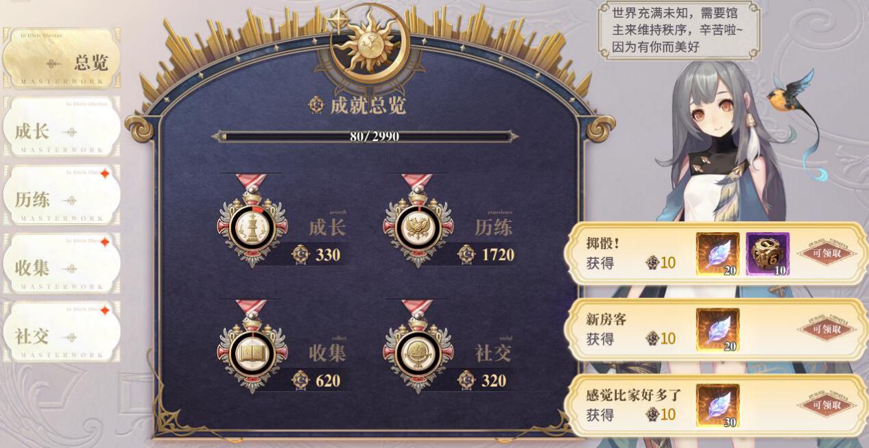 《幻书启世录》的成就系统非常完善,这其中包含大量的成就任务,完成成就任务能获得很多传世玉叶。有人问如何才能在早期快速完成成就,积攒传世玉叶,今天我就和大家聊一聊,快速完成成就获得叶子的方法。整体总结1、成就任务从易到难:社交<成长<收集<历练。2、社交成就难度最低最易完成,成长成就升级过程中就能完成。3、收集成就有难有易,历练成就最多最复杂。社交成就这是最容易完成的成就任务,任务难度也