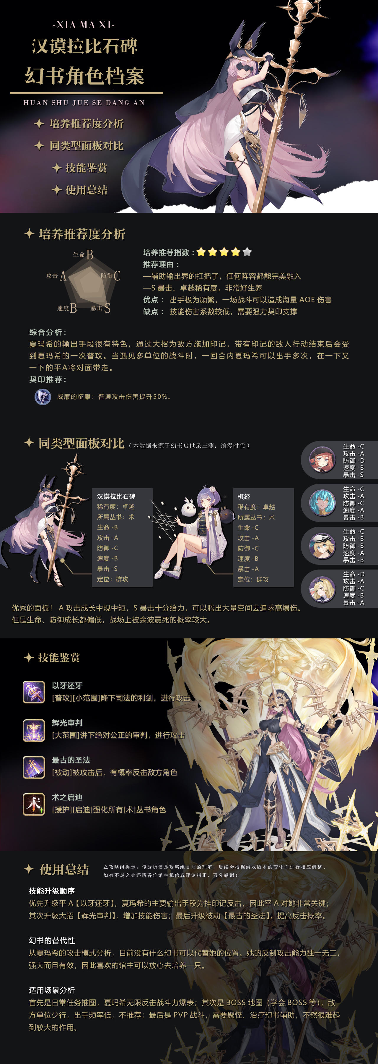 在耀眼的辉光中迎接《汉谟拉比石碑》的审判吧!《汉谟拉比石碑》夏玛希的输出手段很有特色,通过大招为敌方施加印记,带有印记的敌人行动结束后会受到夏玛希的一次普攻。当遇见多单位的战斗时,一回合内夏玛希可以出手多次,在一下又一下的平A将对面带走。同时她具备S暴击、卓越稀有度的优势,补完门槛低,暴击压力小,是个培养性价比很高的群攻幻书。