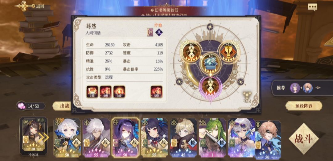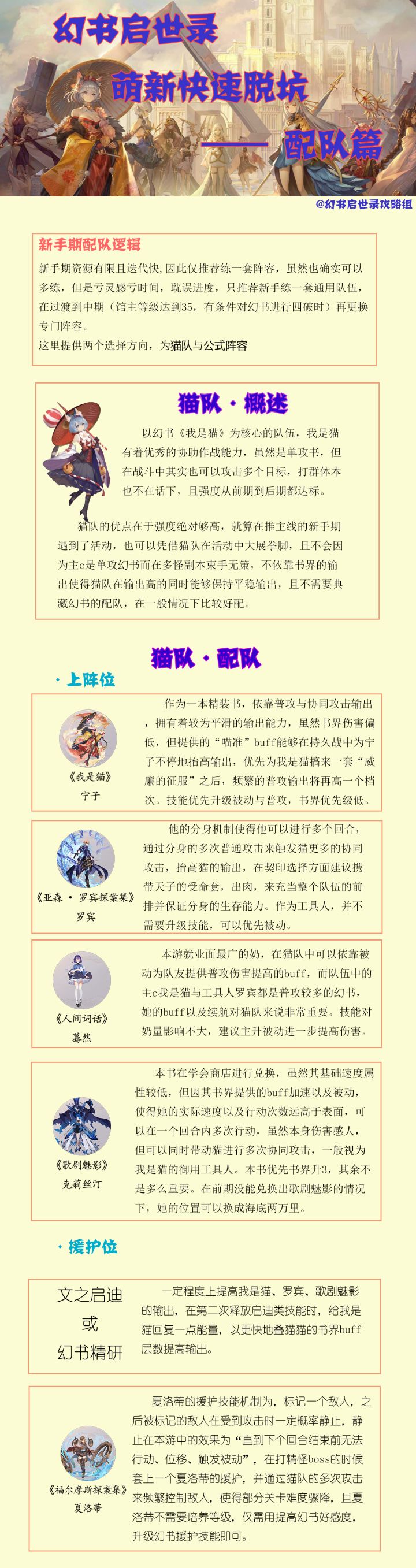 50歌剧,50学妹,要求歌剧中间最好带个生命防御,学妹阿育王套即可,猫猫要60级90暴击535技能比较靠谱,卡俄斯可以让文华吃不到增益,抱朴子可以给猫启动一个准备时间,学妹可以换文华。