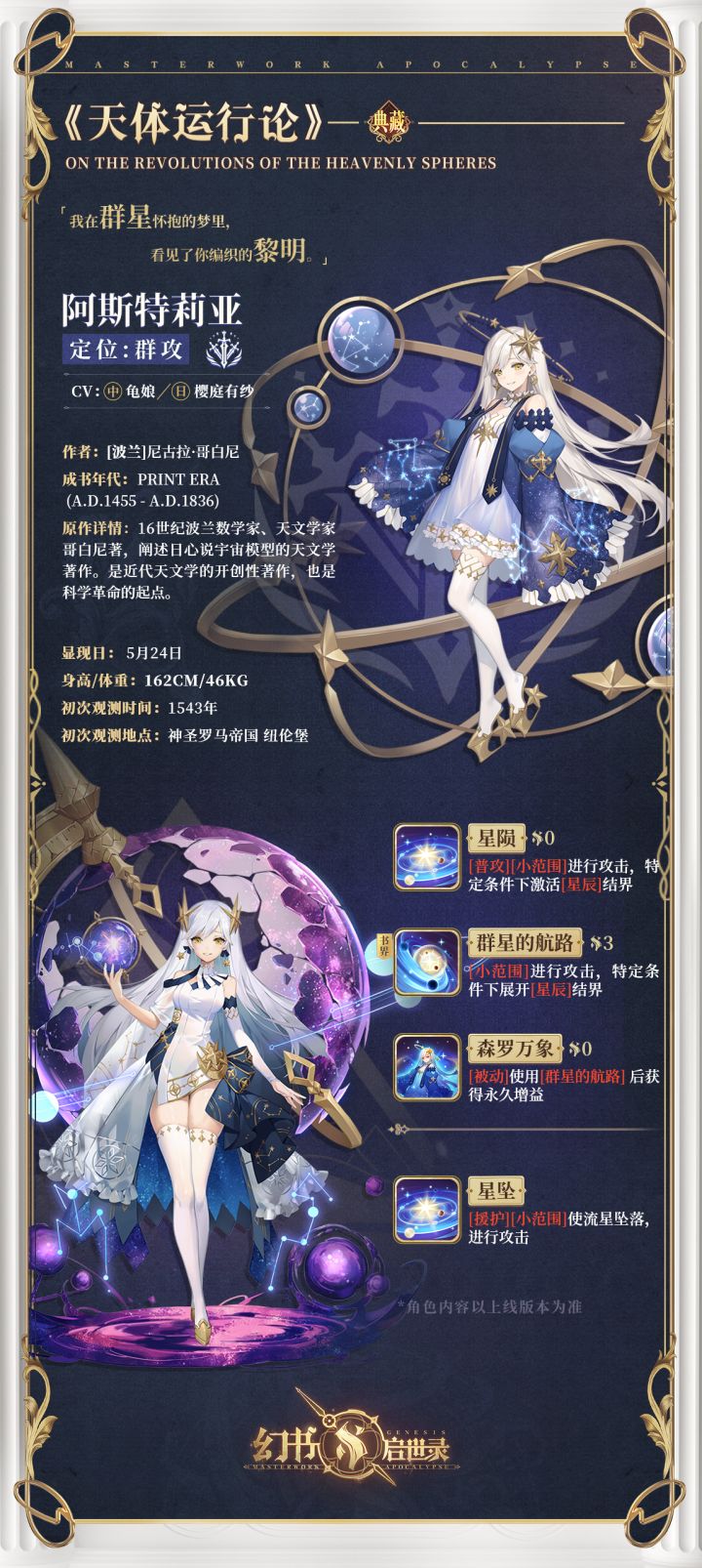 万物静寂、星尘散尽,一切都渲染着《天体运行论》·阿斯特蕾亚的神秘和孤寂。她在自己宇宙中环行遨游,从浩瀚烟波到绚丽星辰,熠熠光辉围绕在她左右。可耳畔却始终传来重复的咒骂,仿佛这也是她生命的一部分。阳光不会褪去所有的阴霾,天使也会被命运捉弄。这一次,她能否将命运掌握在自己的手中呢?《天体运行论》·阿斯特蕾亚现已来到阿克夏书馆!馆主大人,准备好跟姬一起迎接她的到来了吗~