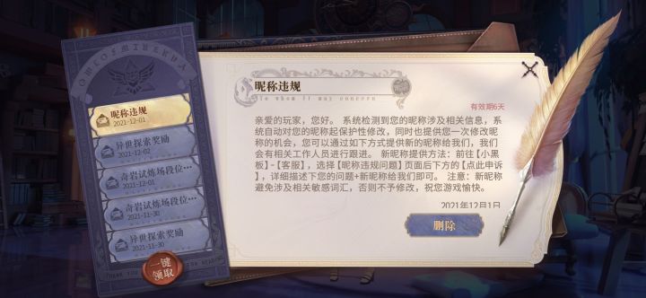 从开服那天开始用的名字,用了三百多天了,今天突然告诉我,呢称违规了?游戏不更新,活动不更新,卡池不更新,都没怎么样,现在真的生气了。你要是早点跟我说了也没怎么样,现在真的过分了。
