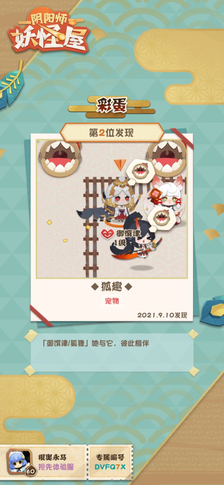 彩蛋1:「狐趣」御馔津/狐狸/宠物,狐狸从远处跑过来时,点击御馔津触发。彩蛋2:「丰饶之境」御馔津/庭院/单人,御馔津身边长出稻穗时,点击御馔津触发。彩蛋3:「津坷垃」御馔津/庭院/单人,御馔津身上掉落袋子,点击袋子触发。彩蛋4:「赤影一瞬」赤影妖刀姬/双人,赤刀身上冒火光时,点击赤刀触发。彩蛋5:「炎刃」赤影妖刀姬/双人,赤刀放在鬼切旁边,等她说“你也是主人的兵刃么?”,点击赤刀触发。(