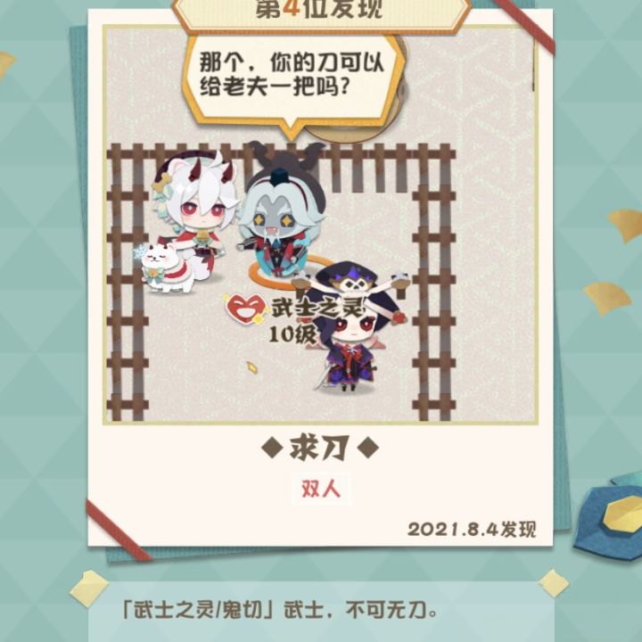 彩蛋1:「求刀」武士之灵/鬼切/双人,武士之灵星星眼对鬼切说:“那个,你的刀可以给老夫一把吗?”,点击武士之灵触发。彩蛋2:「原谅」鬼切/茨木童子/双人,不需要点击式神,也不需要进行任何操作,等待自动触发即可(策划的良心)彩蛋3:「同胞」鬼切/酒吞童子/双人,不需要点击式神,也不需要进行任何操作,等待自动触发即可(策划的良心)彩蛋4:「与赤雪玩耍」鬼切/单人/皮肤,必须穿戴纸韵皮肤。鬼切挥手
