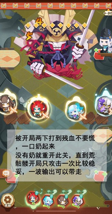 1.根据关卡特点,及时调整式神顺序。2.当前关卡可以反复重新挑战,但一旦失败就结算。当自己血量不足,或者拖的回合过长,一定要提前选择重开!!提前很重要,奶妈被控奶不上来,感觉不对劲就重开,量力而行。3.注意避让回血石,不小心碰碎了也没关系,酌情继续打或者重开。1-10,石距,无难度11-20,荒骷髅难点20关:荒骷髅boss伤害高,有时开局会连续攻击两次。如果你选择了大蛇契约这个道具,建