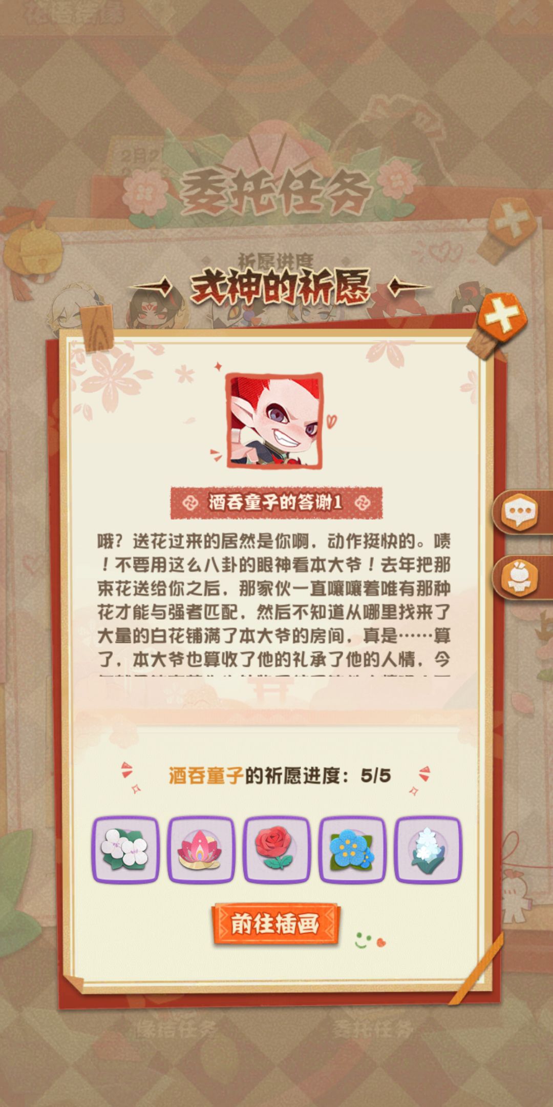 🌹花语结缘 正式服版攻略已发布→ 正式服开启花语结缘活动时[各式神祈愿所需花卉顺序]仅供参考;[花卉花语]不受影响。"缘结任务"获得的花卉不会保留至第二天,记得在当天0点~24点送出。花语结缘活动开启后的第八天(包括周三在内)早8点~活动结束,商店-杂货会出售花束(6种花卉)与巧克力。商店-杂货出售的6种花卉和巧克力(每种每日限购10次),花语结缘活动结束时同时下架。单个巧克力投喂给式神是