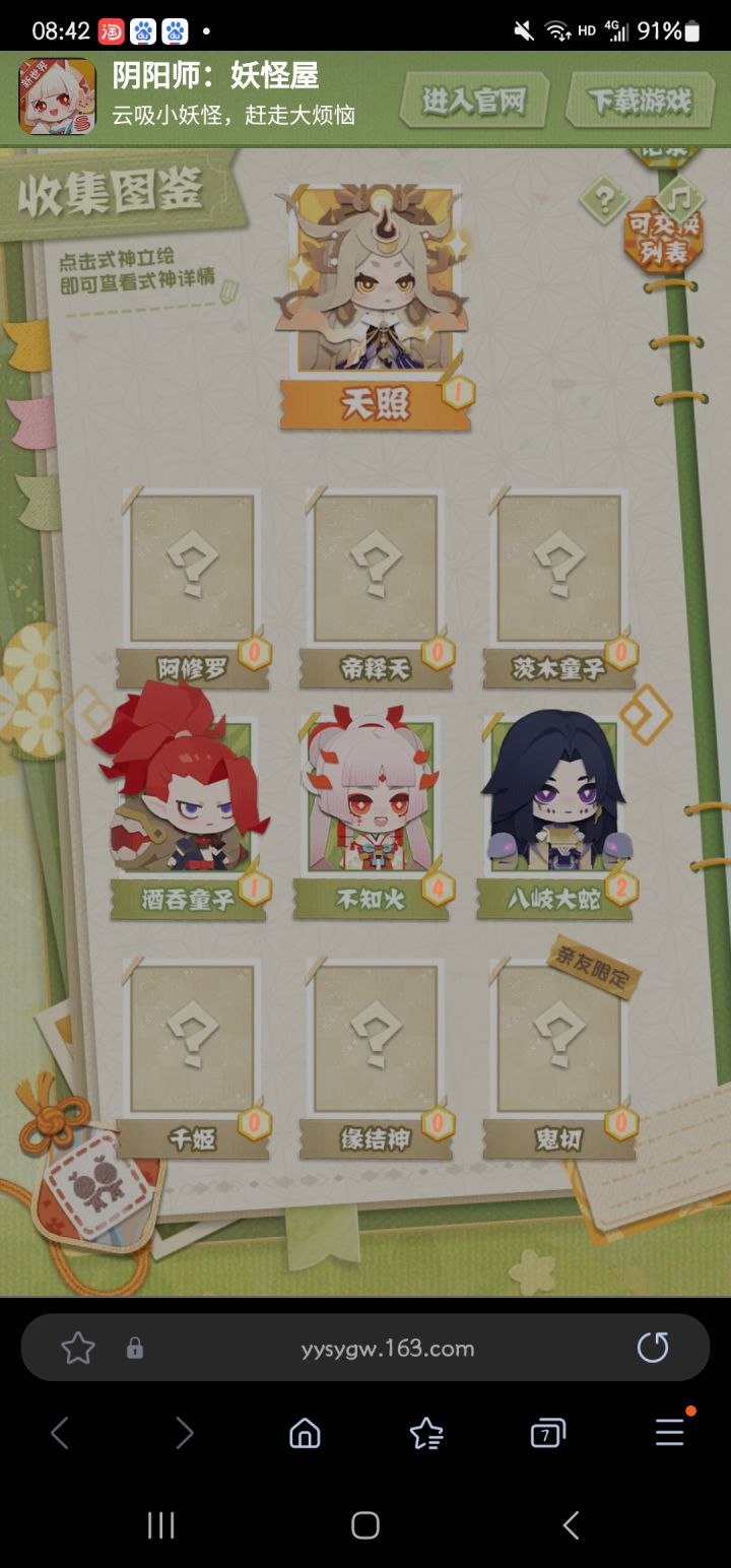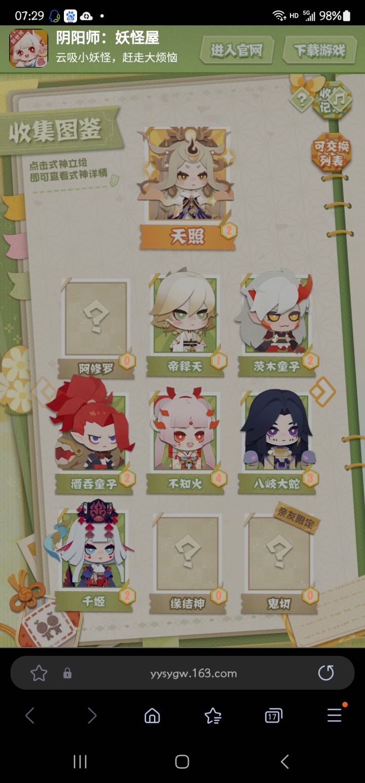 我拥有的:【茨木童子】【酒吞童子】【不知火】【八岐大蛇】【千姬】我需要的:【阿修罗】【缘结神】【鬼切】