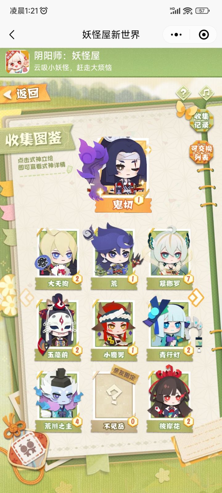 我拥有的:【大天狗】【紧那罗】【玉藻前】【青行灯】【荒川之主】【彼岸花】我需要的:【不见岳】