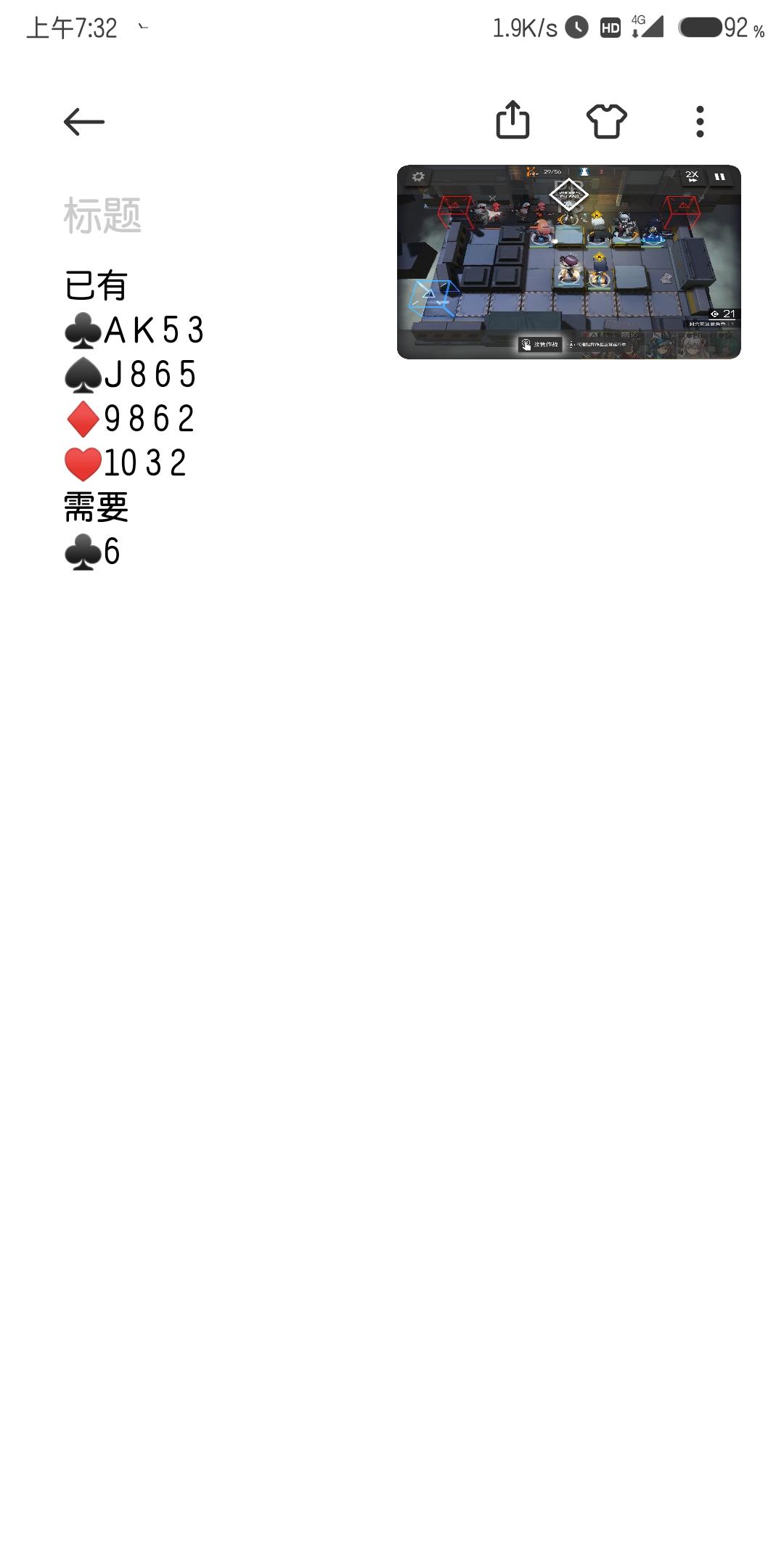 换晴明还缺一张黑桃J大天狗有 ♥️J A 7 8 ♠️ Q 8 9 ♣Q 3 10wx:s2370682273