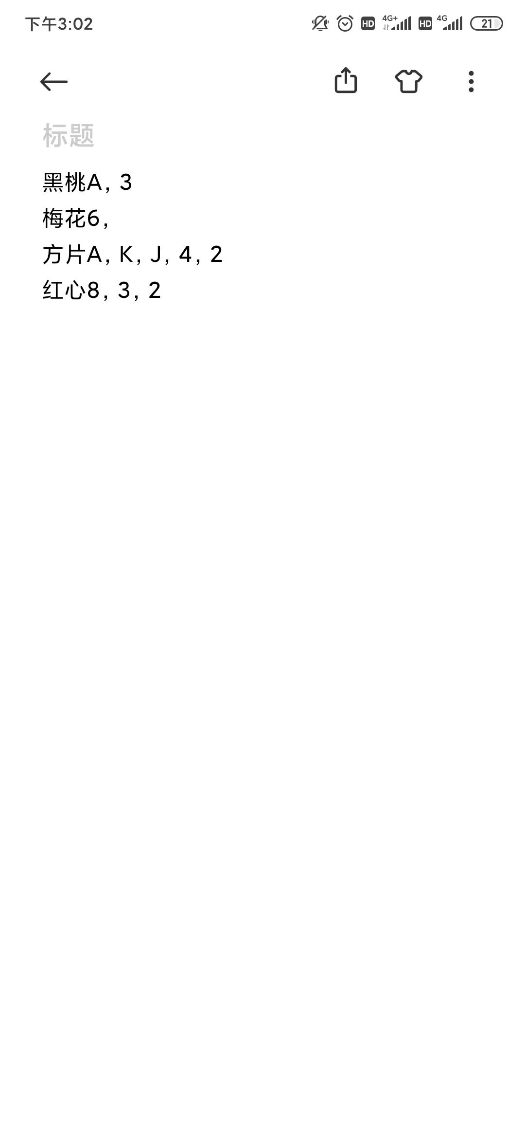 有♥️A Q 6 3 2♠️K Q J 8 7 6 5 2♦️9 4♣️2换♥️J 9 8 7 5 4♠️10 9 4♦️10 7 6 5 3 2♣️A J 10 9 7 6 5 4 3微信号mcx1995726有需要的备注下