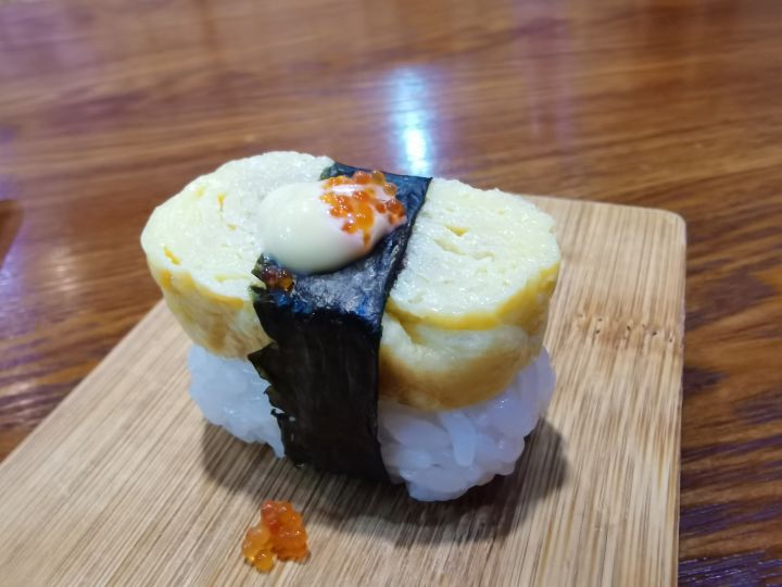 玉子寿司用纸片叠起来虽然容易,但是做起来很麻烦,口感也很复杂。厚蛋烧明显是做过以后立刻冷藏,否则也不会一入口就这么清爽冰牙,但是米饭又是温的。这就很奇怪啊,上牙床很冰,下牙床很暖,一咀嚼,翻个个,两边都有冷暖交织的感觉。搭配鱼籽和日酱油调味,口感更丰富,一层咸,一层鲜,一层甜,一层酸,一层冷,一层热。酱料很乳很酸甜,苔菜就皮掉了,有点韧。