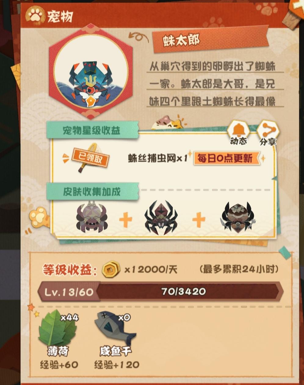 终于有了宠物蛛太郎,给它升级后发现收益那显示每天是有金币收益的!一万多呢~请问这个是要手动点击获取还是会自动获取呀