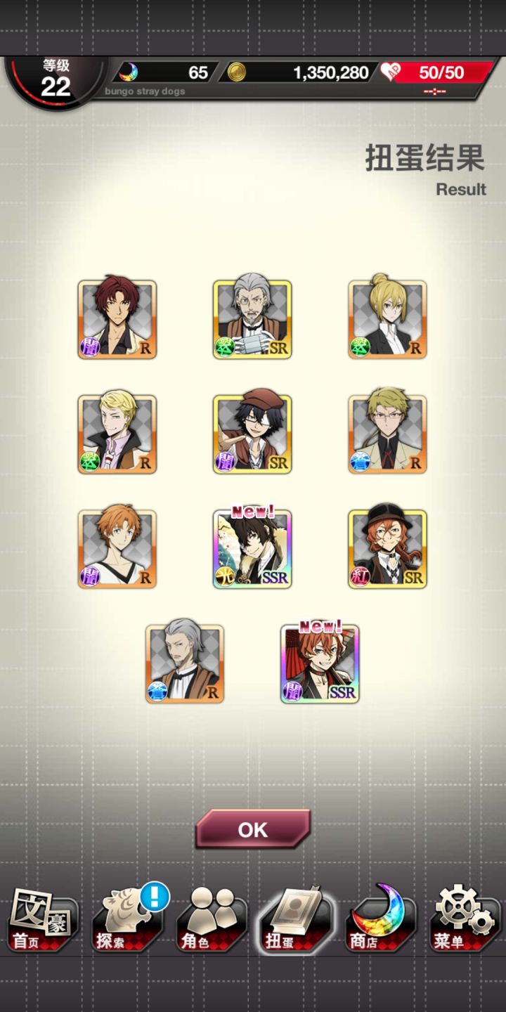 五十一级 抽到了第五个哒崽想记录一下玩到现在有大半年了 中间空了一个月我应该是又不肝(主线的普通关卡才打到第十五章)又不氪的玩家吧(最多冲了100加一次月卡)现在也就是每天登陆一下,打打每日活动,自觉还挺欧的,挺早就慢一面的ssr了(虽然都挺废的)我没特地数,到现在有抽到6个重复的ssr,我毫不犹豫全融了(反正都是没啥用的卡)也没记录。关于觉醒,我倒是把目前能觉醒的卡的觉醒材料都集齐了
