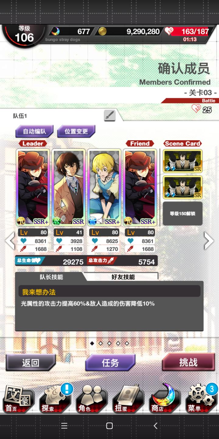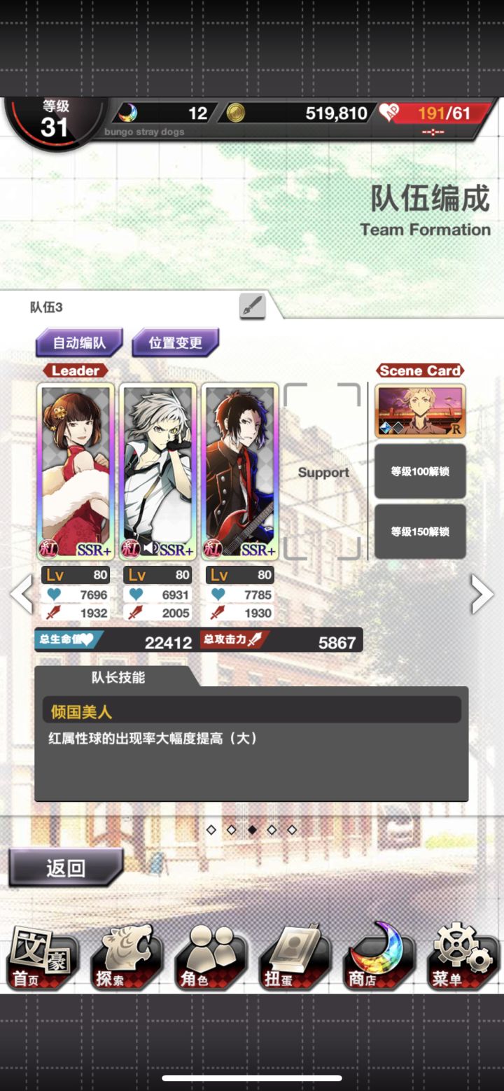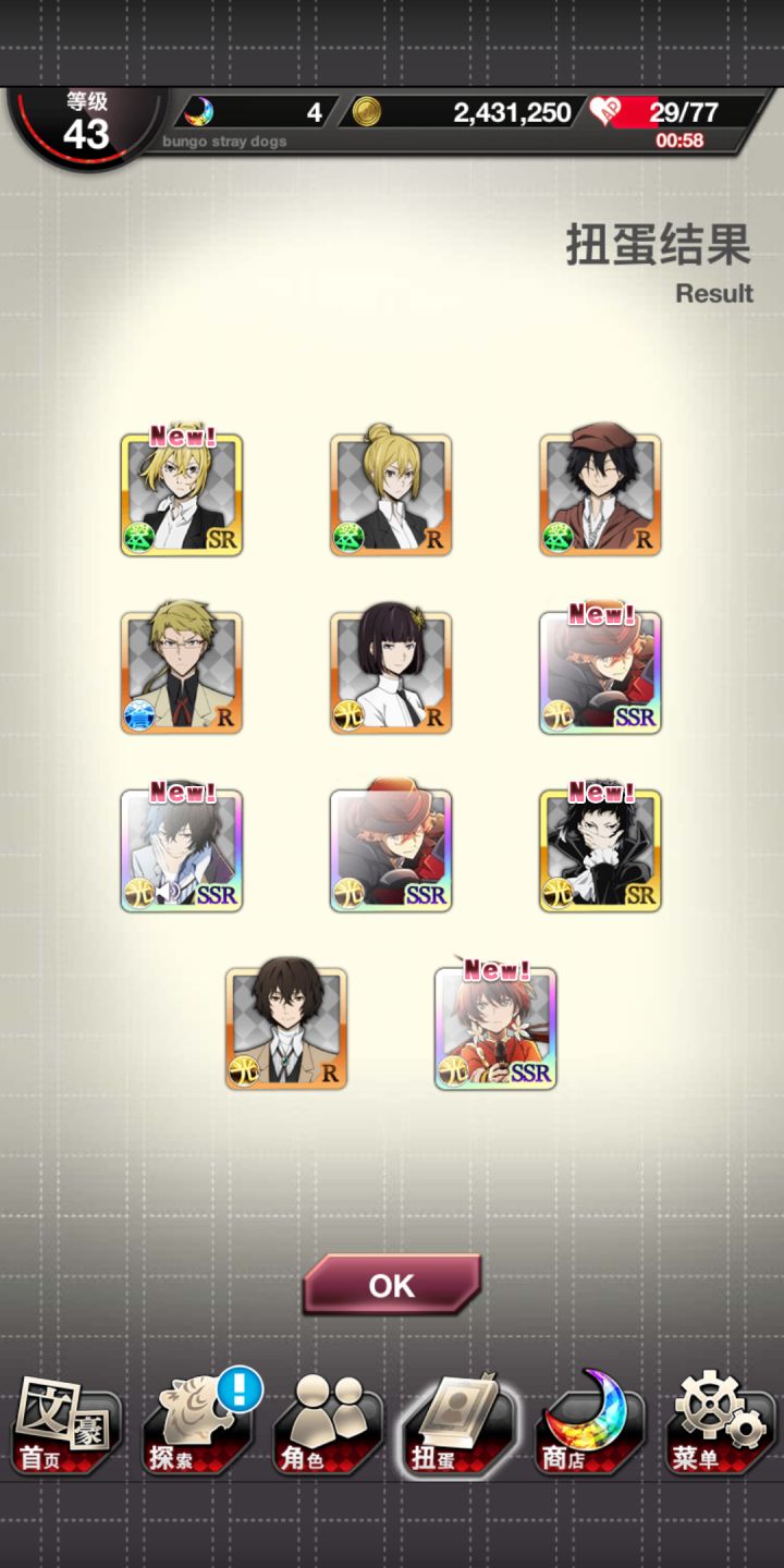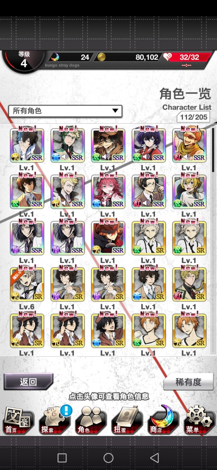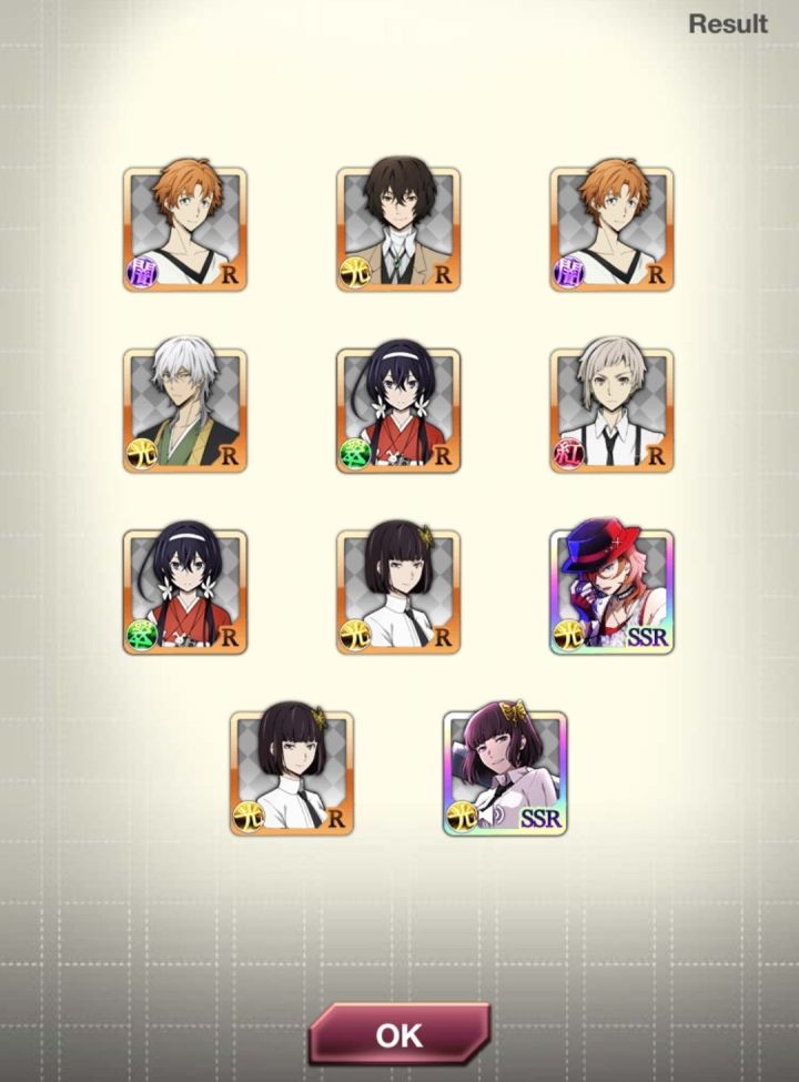 这是今天刚刷满级一套卡组,应该够我以后刷图了。一开始玩这游戏很非,和之前玩的抽卡游戏一样非,结果玩着玩着就发现这个游戏良心多了,今天第一发11连抽到了乐队芥川龙之介,第二发11连抽到了太宰治这游戏就是香