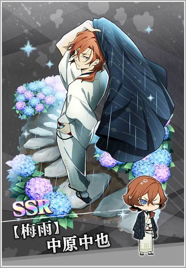 【活动预告】「梅雨」系列主题,即将开启!活动一:期间限定&阶段上升扭蛋复刻-梅雨~ 与平时不同装束的两人,将在期间限定扭蛋中再次登场!活动时间:7月2日13:00~7月11日12:59②阶段上升扭蛋:到达第三阶段必得SSR角色*1,到达第五阶段可获得SSR【梅雨】中原中也、 SSR【梅雨】森鸥外其中一个,到达第六阶段SSR出现率高达1.5倍且不限次数!活动二:复刻掉落活动【细雨走过的漫