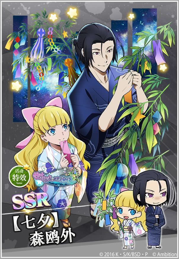 【活动预告】「七夕」系列主题,即将开启!活动一:期间限定&阶段上升扭蛋-七夕~ 七夕主题限定角色,将在期间限定扭蛋中登场!活动时间:7月7日13:00~7月21日12:59②阶段上升扭蛋:到达第三阶段必得SSR角色*1,到达第五阶段可获得SSR【七夕】森鸥外、 SSR【七夕】梶井基次郎、SSR【七夕】尾崎红叶其中一个,到达第六阶段SSR出现率高达1.5倍且不限次数!活动二:大型收集兑换