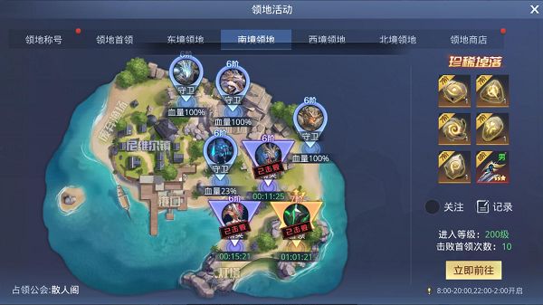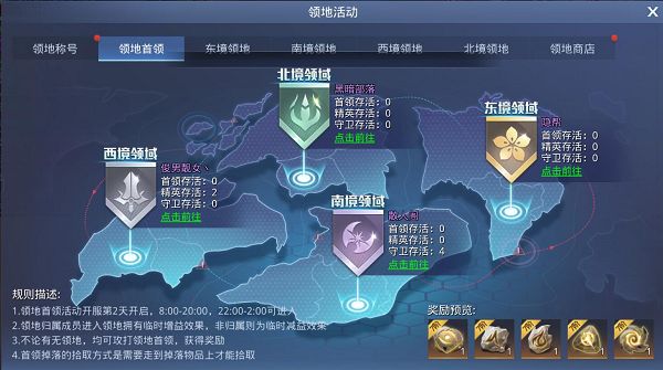 领地首领活动在开服第2天开启,开启时间为8:00-20:00,22:00-2:00可进入!领地分为4个,每个公会只能战力其中一个!每个占领公会前10名成员均可获得对应的领地称号,这个称号的限时的,榜单会在每天23点刷新排行,也会重新根据榜单排行重新分配对应的称号,请保持战力提升哦!领地归属成员进入领地拥有临时增益效果,非归属则为临时减益效果,而且不论是否有领地,均可攻打领地首领,获得奖励首领