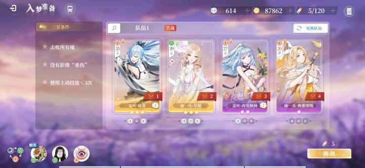 战斗打法:由于【康一乐·心愿】是群攻,所以注意要集中伤害打主要敌人,小怪可以技能打死。常规操作:每一波战斗开始锁定中间敌人,【易子洋·记忆拼图】放技能给【康一乐·心愿】,接着直接下群攻技能,CD好了就放,十分无脑。[共鸣]用完了就再补上,没血了加血,念力有多就放【易子洋·十万公里】的技能。进阶操作:【康一乐·心愿】的技能比较特别,每次攻击都可以增加潜能值,所以潜能叠起来很快,第一次技能放完