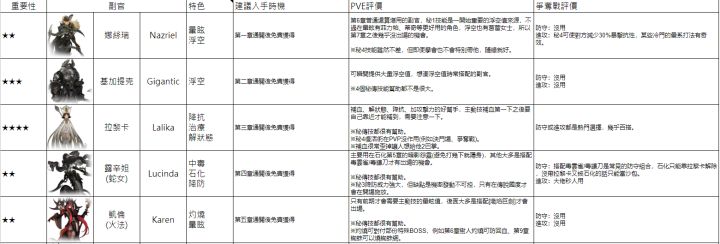 1. 每位副官都有「流星石」可以強化救世主的能力,最終來說每位副官都要取得。2. 副官魂石優先用於[秘傳技能]>[進階]>[乙太能量刻印]。3. 這邊列的特色會與遊戲內少一些, 主要是只列比較重要的, 如果不會因為那個狀態而使用那個副官, 就不會特別列出。※例如基加提克雖然可以上擊倒狀態, 但不會為了擊倒而使用基加提克, 所以就不會列。