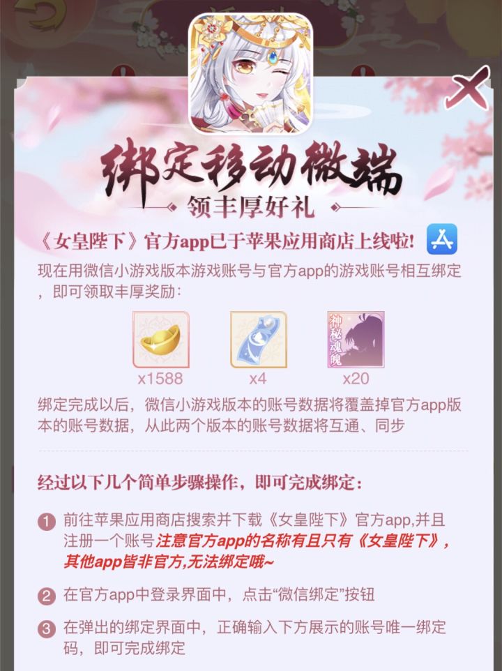 因为楼主刚入坑的时候走了很多弯路所以决定分享一下自己的经验,帮助新手少走弯路❤️tip1:账号注册篇这条仅针对微信小程序和APP客户端不要直接在APP客户端注册,至于为什么呢?且听我说①先在微信小程序创建账号,然后再去APP绑定账号这样轻轻松松你就比直接在APP创建账号的人多了1588元宝,4张霓裳抽奖券和20神秘灵魂碎片。是不是美滋滋?②微信小程序的账号,在绑定APP端之后,依