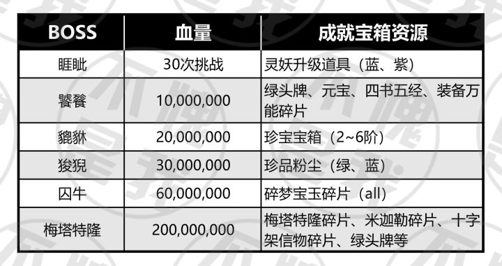 【家族秘境玩法速报】第一天只能开最低等级[幻影],目前全通关,应该明天才能开中级。先说最低级部分的情况。总结:非常简单,能通关51的家族低级秘境是随便打的。‼️ 重点来了——1、成就给的钥匙是一周刷新一次,大号的钥匙主要留给梅塔特隆;2、睚眦是180个小怪,10万的迷你号就能打,固定消耗30把钥匙,拿小号去填最好;3、低级秘境所有BOSS都很简单,正常试炼阵容即可,血量如图;4、秘