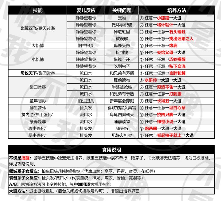2.0版本整合了游学道具、高级藏宝图合成所需的全部技能,同时也补充了一些经常被问及的技能。【养娃攻略2.0】不愧是食用说明:1、独宠无法培养,装备系白板娃概率出;2、高级藏宝图相关技能详细攻略见:http://t.cn/A6waU8lf3、养娃攻略1.0详见: https://www.taptap.com/topic/85738444、攻略组所发布的成果为组内成员个人总结,非官方,部分